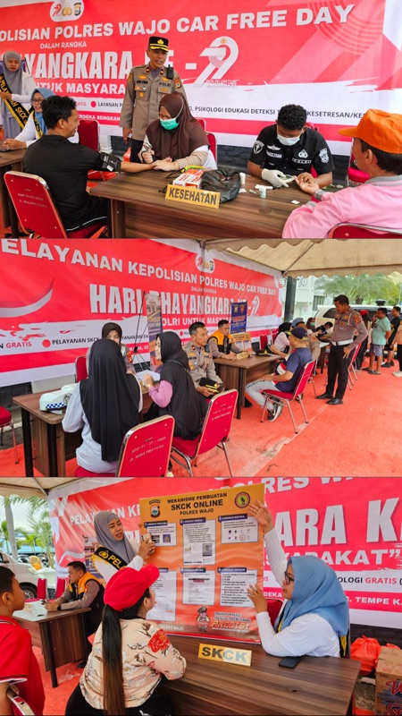FAJARTIMURNEWS.com WAJO – Dalam rangka menyambut Hari Bhayangkara ke-79 yang diperingati setiap tanggal 1 Juli, Polres Wajo melaksanakan kegiatan pelayanan publik kepada masyarakat yang dipusatkan di area Car Free Day, Lapangan Merdeka, Kelurahan Siengkang, Kecamatan Tempe, Kabupaten Wajo, Minggu pagi (22/6/2025).