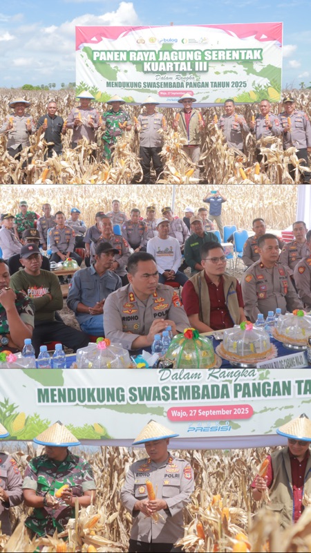 FAJARTIMURNEWS.com WAJO – Polres Wajo bersama unsur Forkopimda dan masyarakat tani ikut melaksanakan kegiatan Zoom Meeting dan Panen Raya Jagung Serentak Kuartal III Tahun 2025 di Desa Tadangpalie, Kecamatan Pammana, Kabupaten Wajo, Sabtu (27/9/2025) pukul 11.00 WITA.