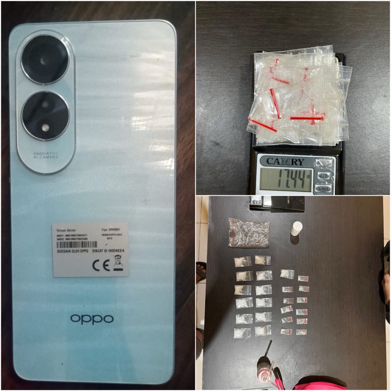 Dengan demikian jumlah sabu yang ditemukan sebanyak 24 paket seberat 17,44 gram. Selain itu, dari dalam kamar pelaku, juga ditemukan 1 alat isap sabu (bong), 1 timbangan/skil warna hitam, 1 botol plastik kecil warna putih, 1 kantong plastik klip kosong ukuran sedang serta 1 unit hand phone jenis OPPO.