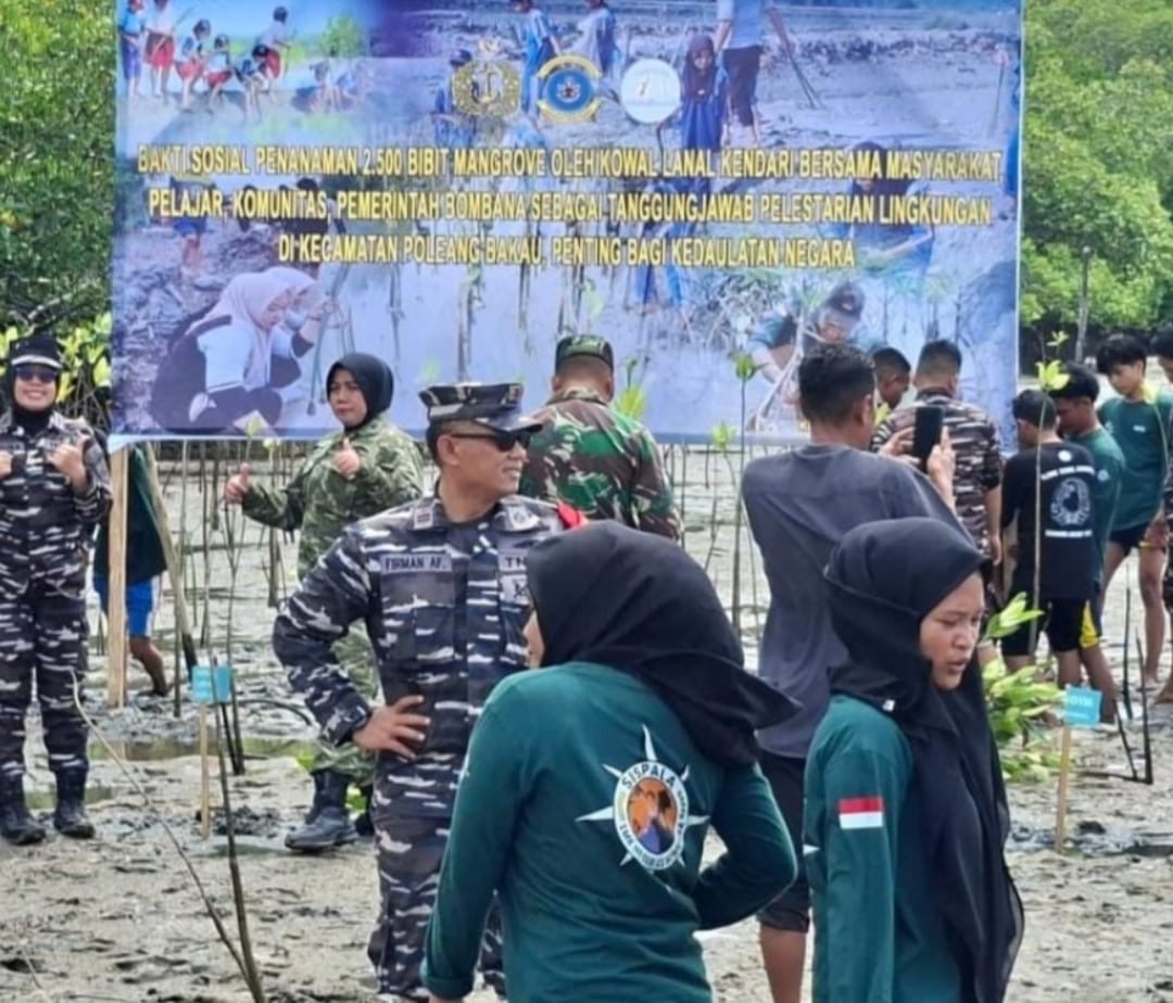 Salah satunya melalui kegiatan bakti sosial penanaman mangrove yang sekarang dilaksanakan oleh Korps Wanita Angkatan Laut (Kowal) Lanal Kendari bersama masyarakat, pelajar, komunitas, dan Pemerintah Kabupaten Bombana di Pantai Kasabolo, Kecamatan Poleang, pada Kamis (8/1/2026).