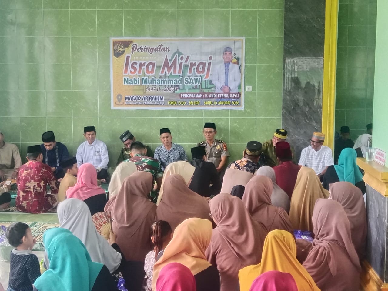 FAJARTIMURNEWS.com WAJO SULSEL ---Dalam suasana penuh khidmat dan keberkahan, Kapolsek Pitumpanua AKP Andi Suhidin, SH, MSi yang diwakili Waka Polsek IPTU Haryadi menghadiri peringatan Isra Mi’raj Nabi Muhammad SAW 1448 H/2026 M yang digelar oleh masyarakat setempat bertempat di Masjid AR-RAHIM Kelurahan Bulete, Kecamatan Pitumpanua,Kabupaten Wajo.Sabtu (10/1/2026).