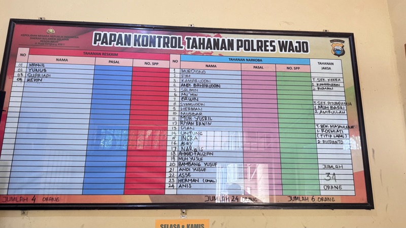 Di rutan Polres Wajo, jumlah tahanan tercatat sebanyak 33 orang. Rinciannya, empat orang merupakan tahanan kasus reserse kriminal, seluruhnya laki-laki. Sementara itu, kasus narkotika mendominasi dengan 24 tahanan, juga seluruhnya laki-laki.