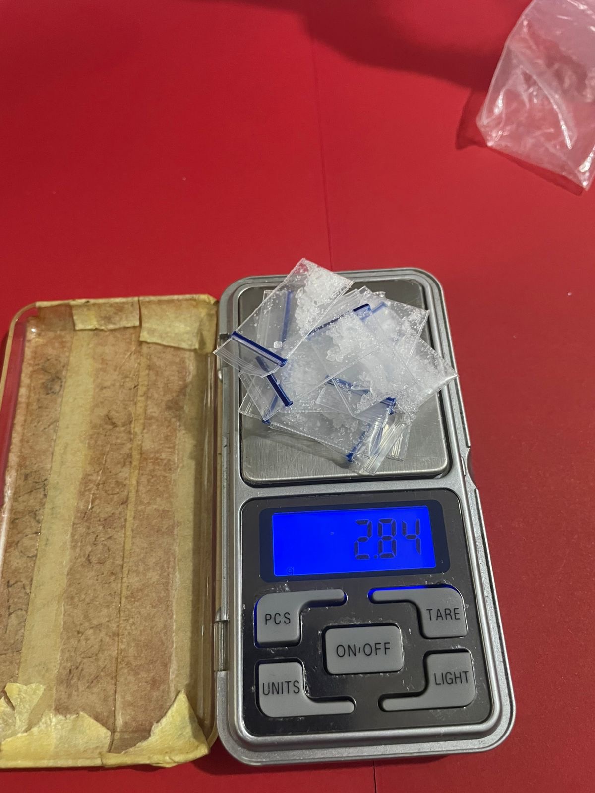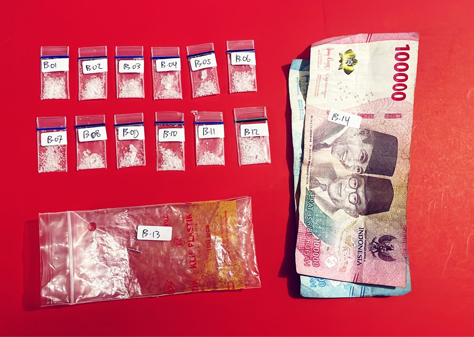 Saat dilakukan penggeledahan badan dan rumah, petugas menemukan barang bukti berupa 12 paket yang diduga sabu dengan berat bruto 2,84 gram, dua plastik klip kosong, serta uang tunai sebesar Rp150.000.